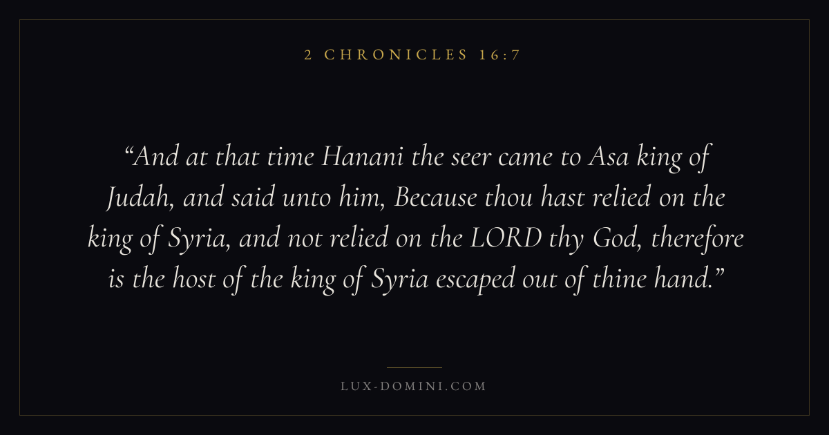 And at that time Hanani the seer came to Asa king of Judah, and said unto him, Because thou hast relied on the king of Syria, and not relied on the LORD thy God, therefore is the host of the king of Syria escaped out of thine hand.