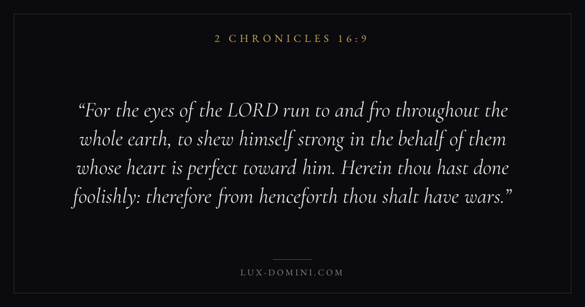 For the eyes of the LORD run to and fro throughout the whole earth, to shew himself strong in the behalf of them whose heart is perfect toward him. Herein thou hast done foolishly: therefore from henceforth thou shalt have wars.