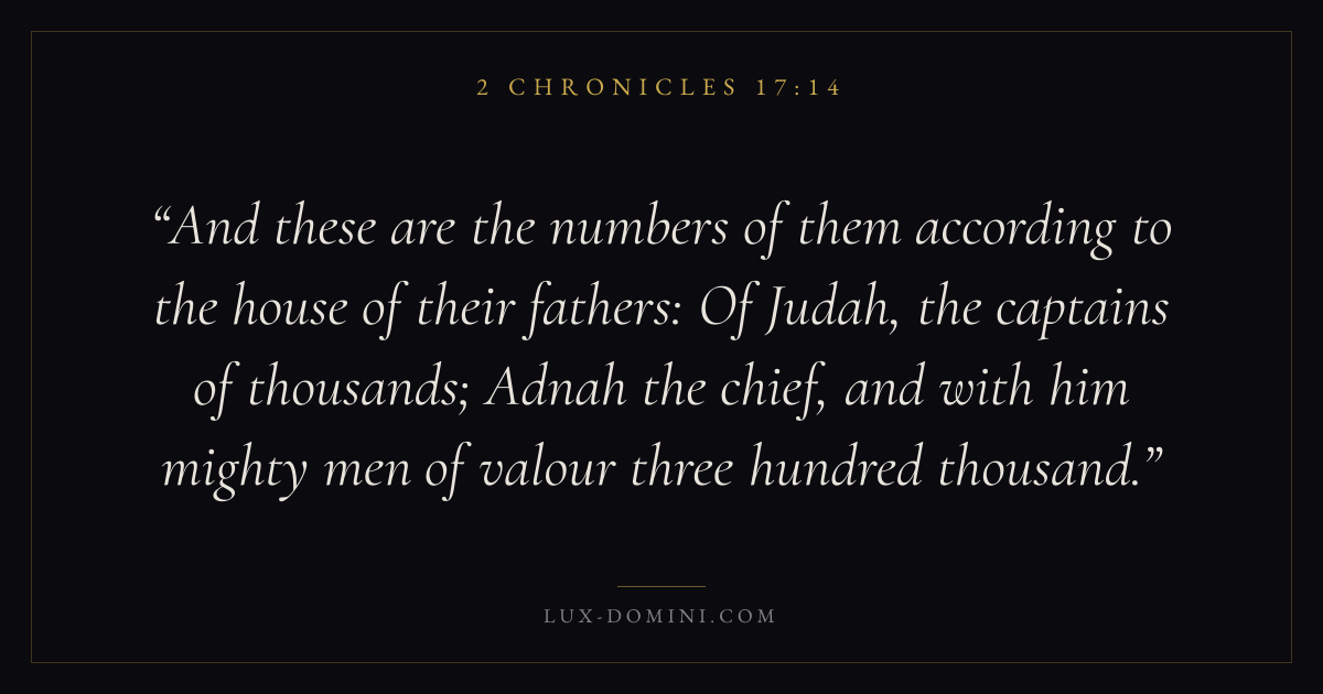 And these are the numbers of them according to the house of their fathers: Of Judah, the captains of thousands; Adnah the chief, and with him mighty men of valour three hundred thousand.