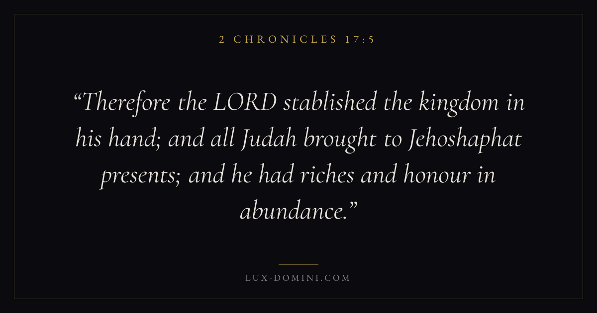 Therefore the LORD stablished the kingdom in his hand; and all Judah brought to Jehoshaphat presents; and he had riches and honour in abundance.