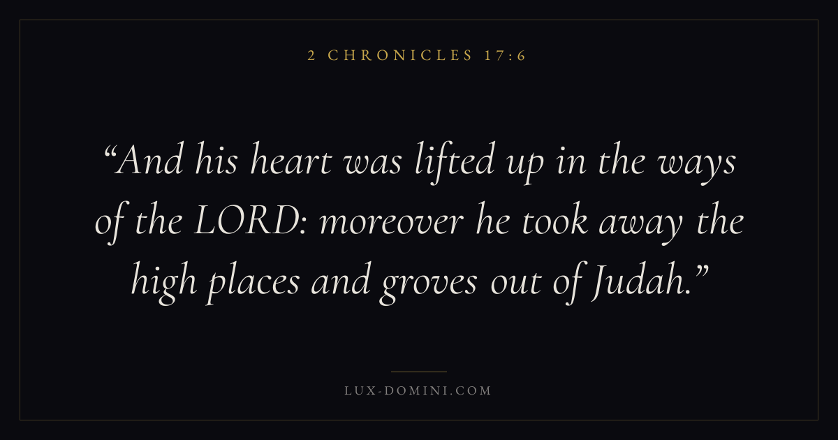 And his heart was lifted up in the ways of the LORD: moreover he took away the high places and groves out of Judah.