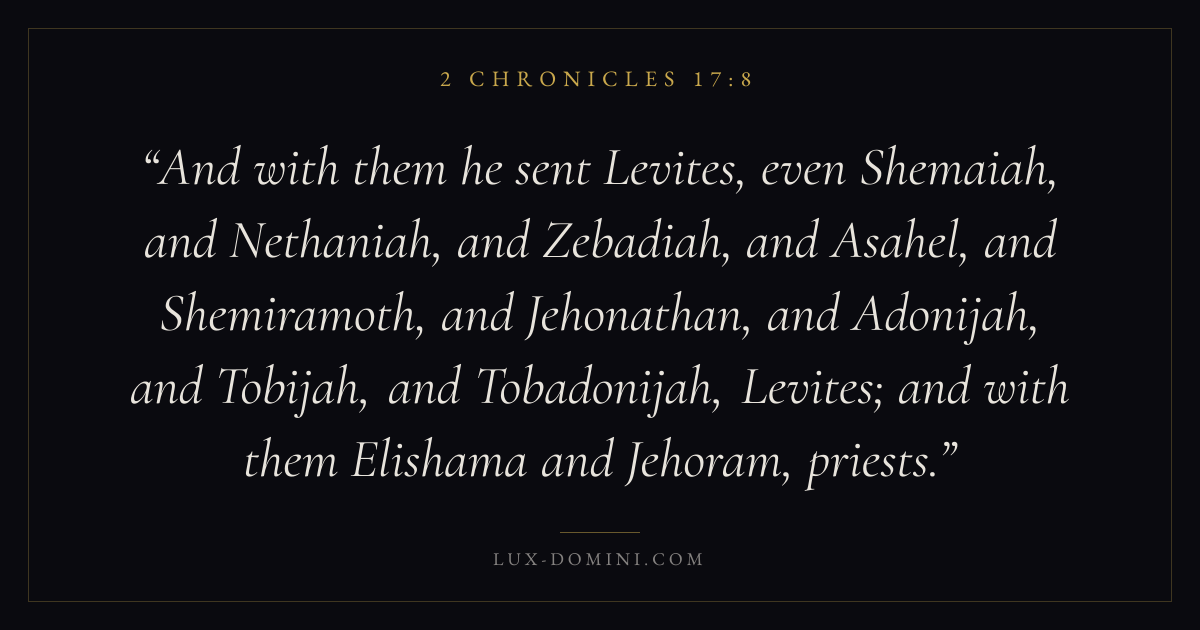 And with them he sent Levites, even Shemaiah, and Nethaniah, and Zebadiah, and Asahel, and Shemiramoth, and Jehonathan, and Adonijah, and Tobijah, and Tobadonijah, Levites; and with them Elishama and Jehoram, priests.