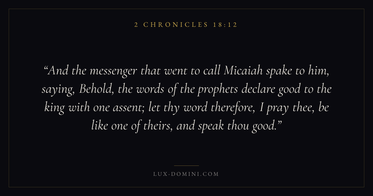 And the messenger that went to call Micaiah spake to him, saying, Behold, the words of the prophets declare good to the king with one assent; let thy word therefore, I pray thee, be like one of theirs, and speak thou good.