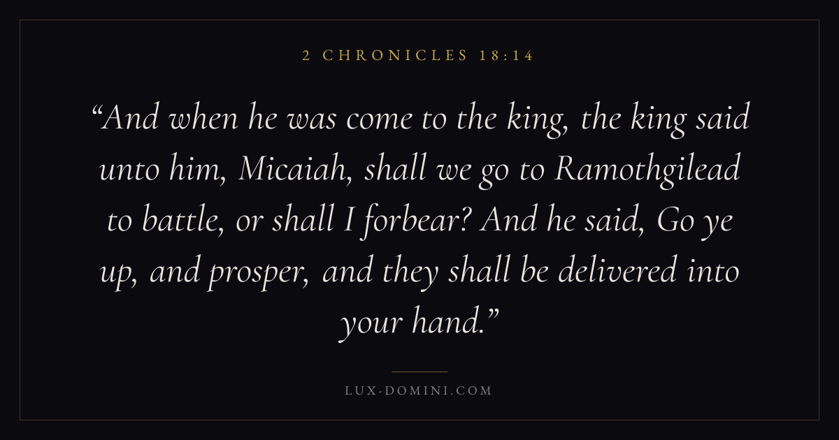 And when he was come to the king, the king said unto him, Micaiah, shall we go to Ramothgilead to battle, or shall I forbear? And he said, Go ye up, and prosper, and they shall be delivered into your hand.