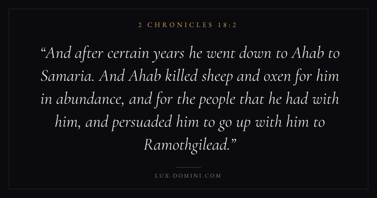 And after certain years he went down to Ahab to Samaria. And Ahab killed sheep and oxen for him in abundance, and for the people that he had with him, and persuaded him to go up with him to Ramothgilead.