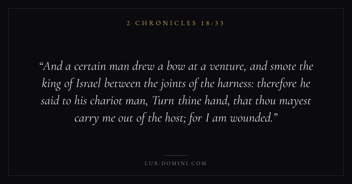 And a certain man drew a bow at a venture, and smote the king of Israel between the joints of the harness: therefore he said to his chariot man, Turn thine hand, that thou mayest carry me out of the host; for I am wounded.