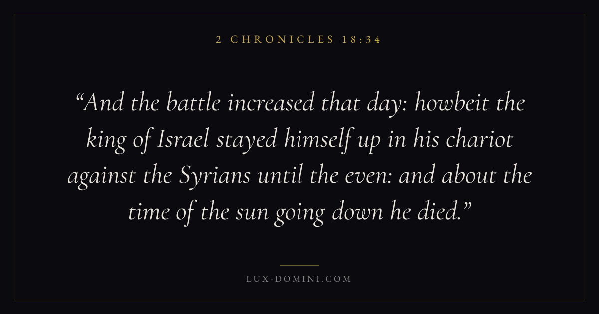 And the battle increased that day: howbeit the king of Israel stayed himself up in his chariot against the Syrians until the even: and about the time of the sun going down he died.
