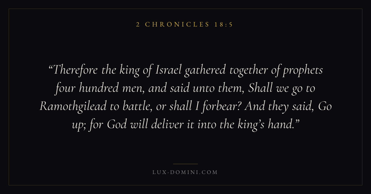 Therefore the king of Israel gathered together of prophets four hundred men, and said unto them, Shall we go to Ramothgilead to battle, or shall I forbear? And they said, Go up; for God will deliver it into the king’s hand.
