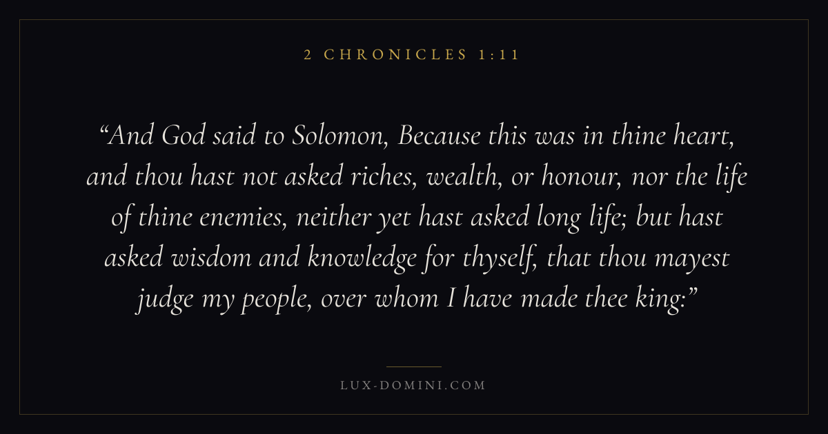 And God said to Solomon, Because this was in thine heart, and thou hast not asked riches, wealth, or honour, nor the life of thine enemies, neither yet hast asked long life; but hast asked wisdom and knowledge for thyself, that thou mayest judge my people, over whom I have made thee king: