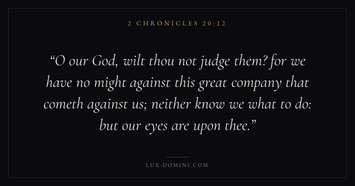 O our God, wilt thou not judge them? for we have no might against this great company that cometh against us; neither know we what to do: but our eyes are upon thee.