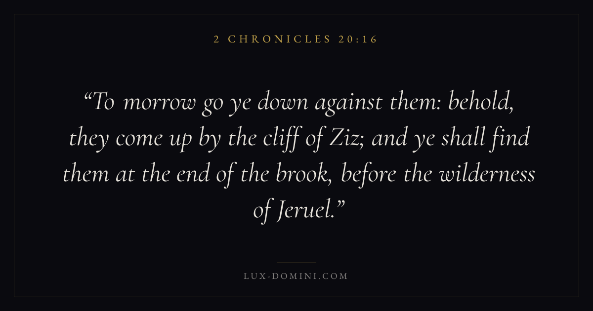To morrow go ye down against them: behold, they come up by the cliff of Ziz; and ye shall find them at the end of the brook, before the wilderness of Jeruel.