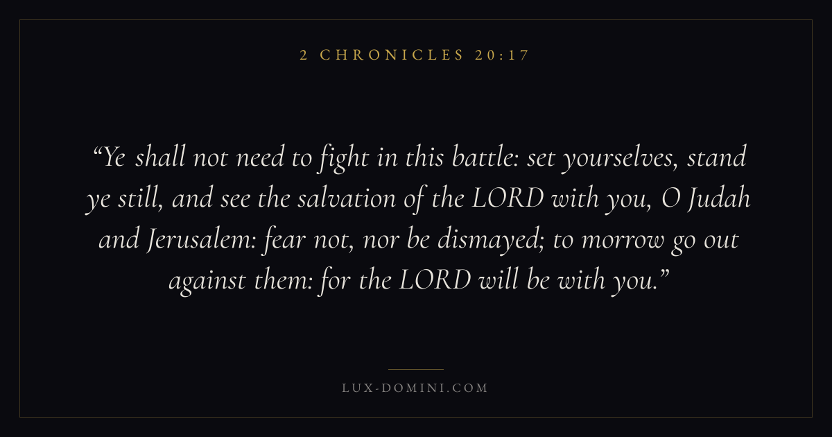 Ye shall not need to fight in this battle: set yourselves, stand ye still, and see the salvation of the LORD with you, O Judah and Jerusalem: fear not, nor be dismayed; to morrow go out against them: for the LORD will be with you.