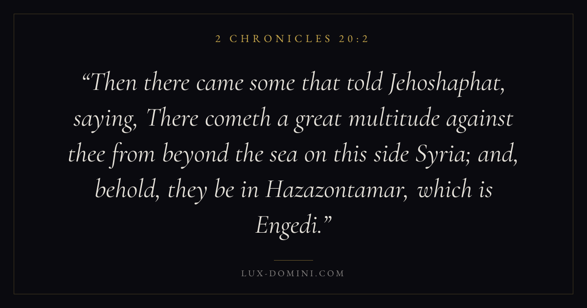 Then there came some that told Jehoshaphat, saying, There cometh a great multitude against thee from beyond the sea on this side Syria; and, behold, they be in Hazazontamar, which is Engedi.