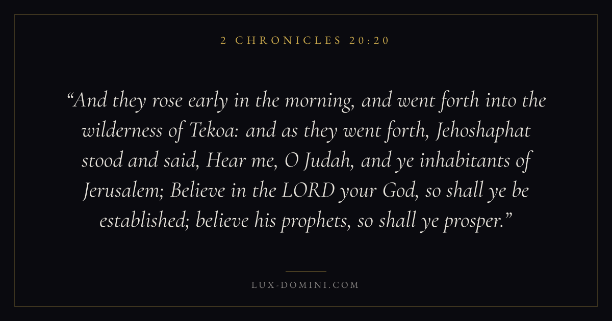 And they rose early in the morning, and went forth into the wilderness of Tekoa: and as they went forth, Jehoshaphat stood and said, Hear me, O Judah, and ye inhabitants of Jerusalem; Believe in the LORD your God, so shall ye be established; believe his prophets, so shall ye prosper.