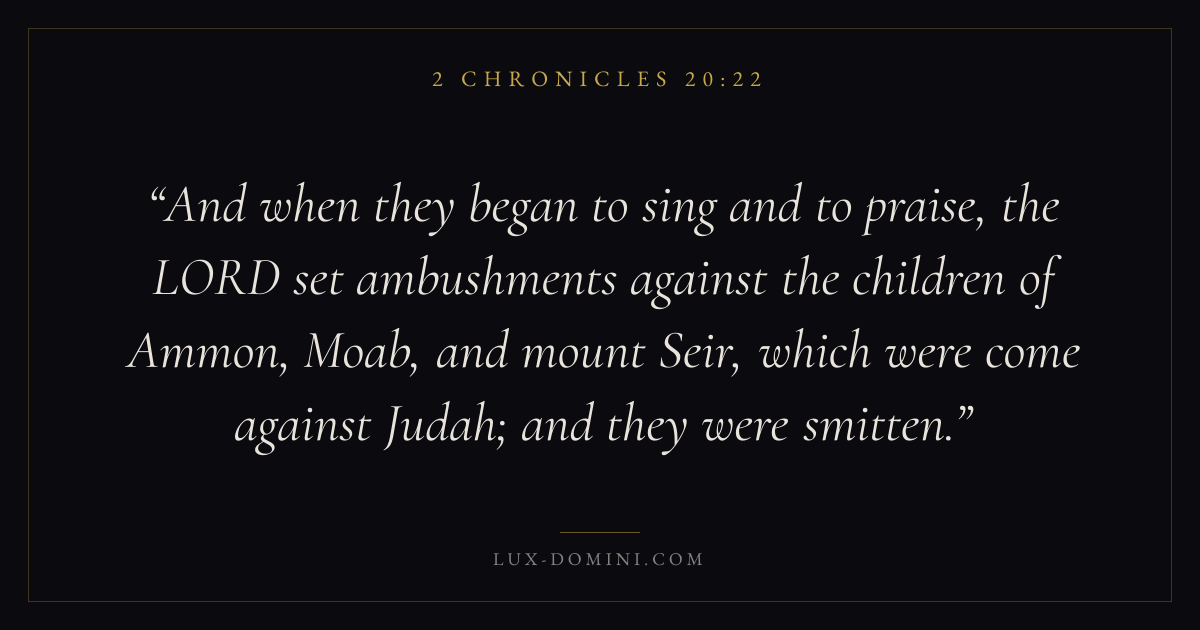 And when they began to sing and to praise, the LORD set ambushments against the children of Ammon, Moab, and mount Seir, which were come against Judah; and they were smitten.