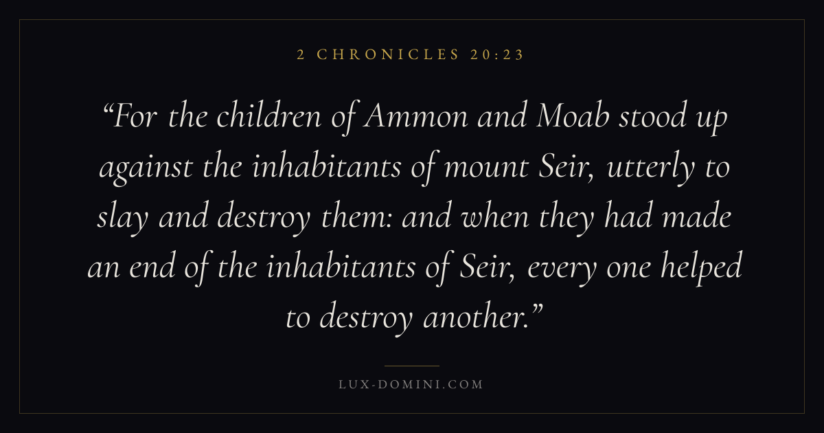 For the children of Ammon and Moab stood up against the inhabitants of mount Seir, utterly to slay and destroy them: and when they had made an end of the inhabitants of Seir, every one helped to destroy another.
