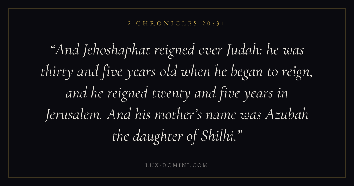 And Jehoshaphat reigned over Judah: he was thirty and five years old when he began to reign, and he reigned twenty and five years in Jerusalem. And his mother’s name was Azubah the daughter of Shilhi.