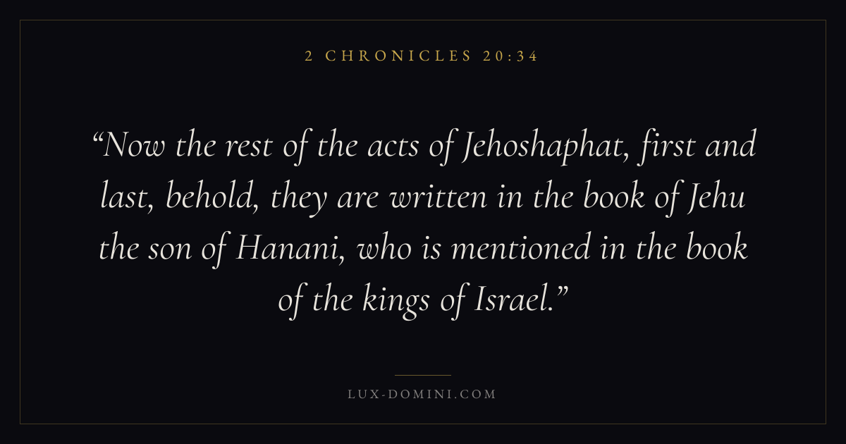 Now the rest of the acts of Jehoshaphat, first and last, behold, they are written in the book of Jehu the son of Hanani, who is mentioned in the book of the kings of Israel.