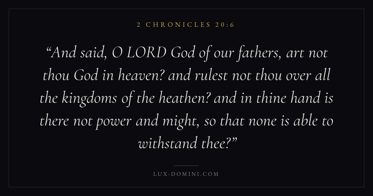 And said, O LORD God of our fathers, art not thou God in heaven? and rulest not thou over all the kingdoms of the heathen? and in thine hand is there not power and might, so that none is able to withstand thee?