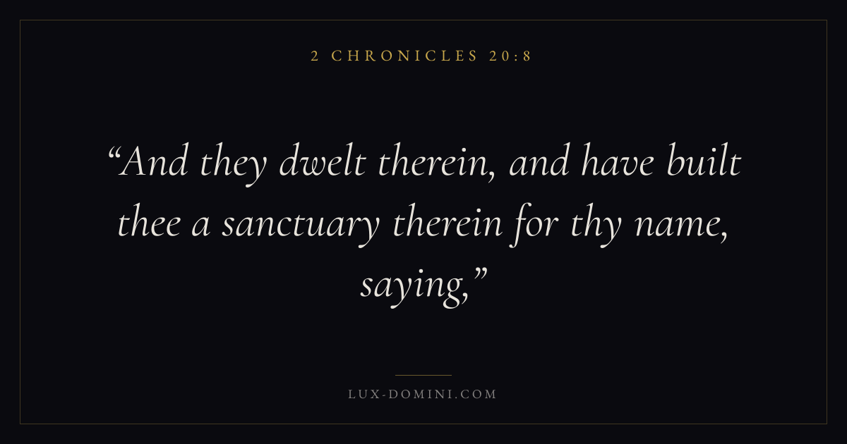 Books / 2 Chronicles / Chapter 20 / Verse 8 ← 2 Chronicles 20:7 2 Chronicles 20:8 2 Chronicles 20:9 → And they dwelt therein, and have built thee a sanctuary therein for thy name, saying, Download verse card Share on Twitter Share on Facebook Pin it ✦ Key themes PrayerJustice and mercyTempleReform Read with 2 Chronicles 20:72 Chronicles 20:9Matthew 6:9Luke 18:1 Related topics Bible verses about prayerBible verses about justice and mercy ✦ 2 Chronicles Chapter 20 verses V. 1 V. 2 V. 3 V. 4 V. 5 V. 6 V. 7 V. 8 V. 9 V. 10 V. 11 V. 12 V. 13 V. 14 V. 15 V. 16 V. 17 V. 18 V. 19 V. 20 V. 21 V. 22 V. 23 V. 24 V. 25 V. 26 V. 27 V. 28 V. 29 V. 30 V. 31 V. 32 V. 33 V. 34 V. 35 V. 36 V. 37