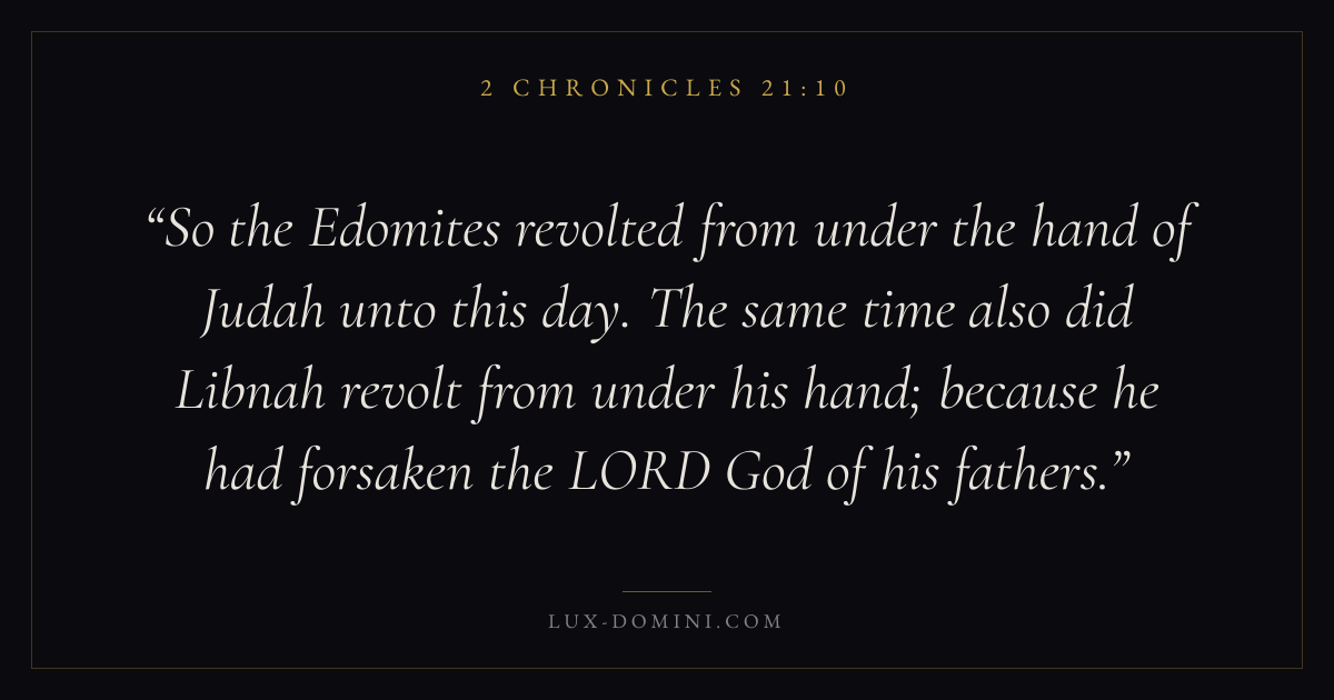 So the Edomites revolted from under the hand of Judah unto this day. The same time also did Libnah revolt from under his hand; because he had forsaken the LORD God of his fathers.