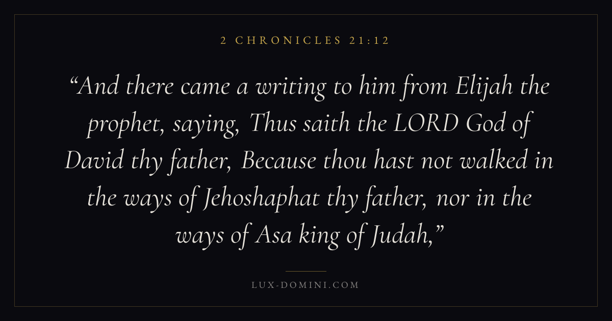 And there came a writing to him from Elijah the prophet, saying, Thus saith the LORD God of David thy father, Because thou hast not walked in the ways of Jehoshaphat thy father, nor in the ways of Asa king of Judah,