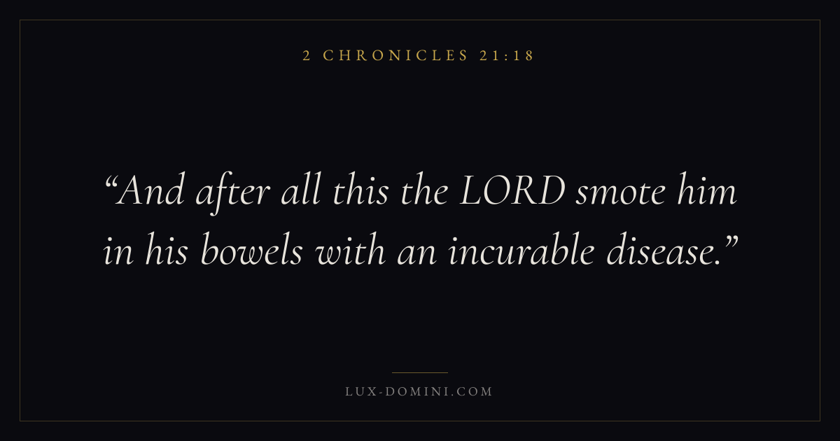Books / 2 Chronicles / Chapter 21 / Verse 18 ← 2 Chronicles 21:17 2 Chronicles 21:18 2 Chronicles 21:19 → And after all this the LORD smote him in his bowels with an incurable disease. Download verse card Share on Twitter Share on Facebook Pin it ✦ Key themes PrayerJustice and mercyTempleReform Read with 2 Chronicles 21:192 Chronicles 21:20Matthew 6:9Luke 18:1 Related topics Bible verses about prayerBible verses about justice and mercy ✦ 2 Chronicles Chapter 21 verses V. 1 V. 2 V. 3 V. 4 V. 5 V. 6 V. 7 V. 8 V. 9 V. 10 V. 11 V. 12 V. 13 V. 14 V. 15 V. 16 V. 17 V. 18 V. 19 V. 20