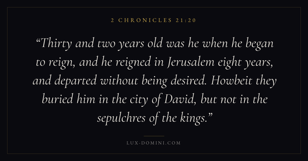 Thirty and two years old was he when he began to reign, and he reigned in Jerusalem eight years, and departed without being desired. Howbeit they buried him in the city of David, but not in the sepulchres of the kings.