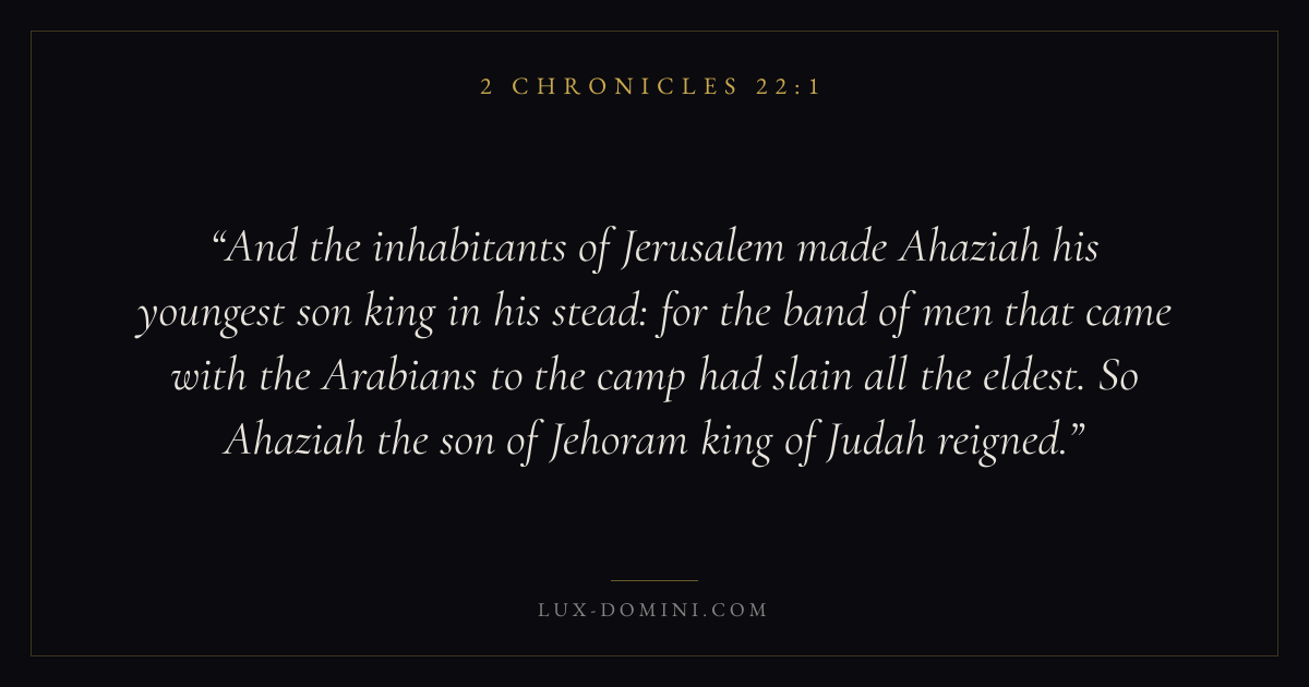 And the inhabitants of Jerusalem made Ahaziah his youngest son king in his stead: for the band of men that came with the Arabians to the camp had slain all the eldest. So Ahaziah the son of Jehoram king of Judah reigned.