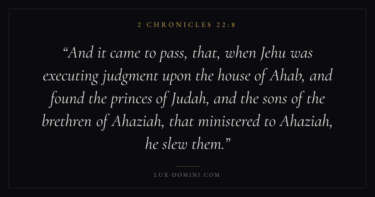 And it came to pass, that, when Jehu was executing judgment upon the house of Ahab, and found the princes of Judah, and the sons of the brethren of Ahaziah, that ministered to Ahaziah, he slew them.