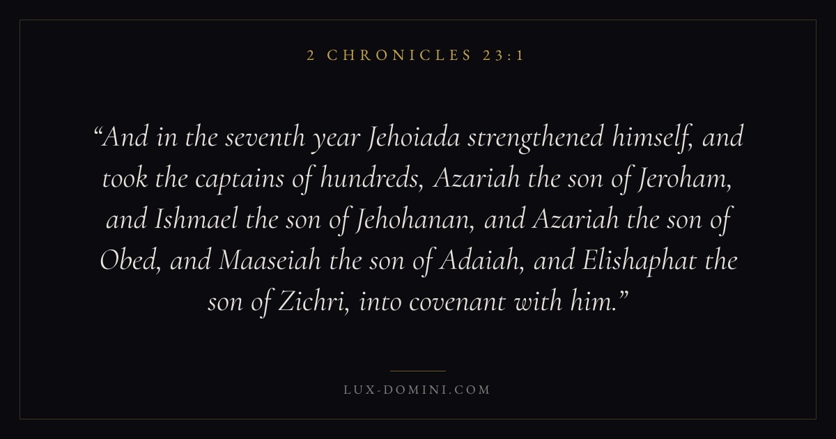 And in the seventh year Jehoiada strengthened himself, and took the captains of hundreds, Azariah the son of Jeroham, and Ishmael the son of Jehohanan, and Azariah the son of Obed, and Maaseiah the son of Adaiah, and Elishaphat the son of Zichri, into covenant with him.
