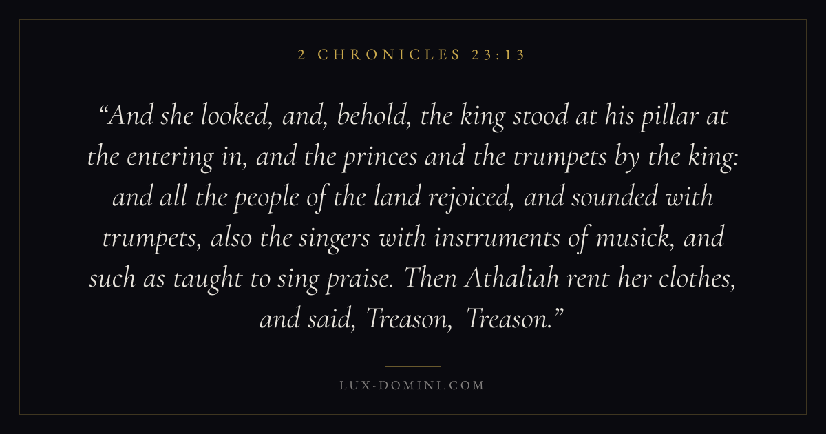And she looked, and, behold, the king stood at his pillar at the entering in, and the princes and the trumpets by the king: and all the people of the land rejoiced, and sounded with trumpets, also the singers with instruments of musick, and such as taught to sing praise. Then Athaliah rent her clothes, and said, Treason, Treason.