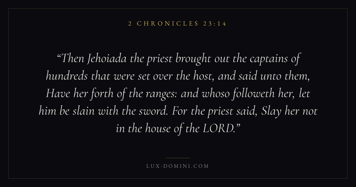 Then Jehoiada the priest brought out the captains of hundreds that were set over the host, and said unto them, Have her forth of the ranges: and whoso followeth her, let him be slain with the sword. For the priest said, Slay her not in the house of the LORD.