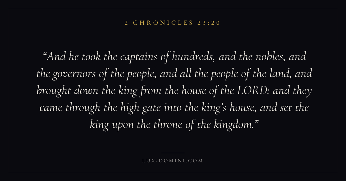 And he took the captains of hundreds, and the nobles, and the governors of the people, and all the people of the land, and brought down the king from the house of the LORD: and they came through the high gate into the king’s house, and set the king upon the throne of the kingdom.