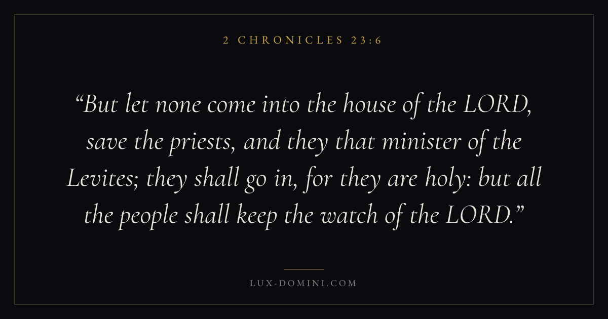 But let none come into the house of the LORD, save the priests, and they that minister of the Levites; they shall go in, for they are holy: but all the people shall keep the watch of the LORD.