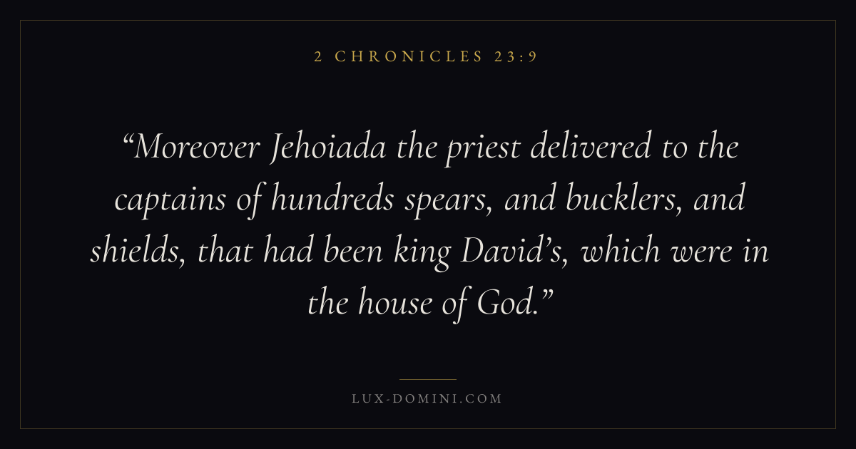 Moreover Jehoiada the priest delivered to the captains of hundreds spears, and bucklers, and shields, that had been king David’s, which were in the house of God.