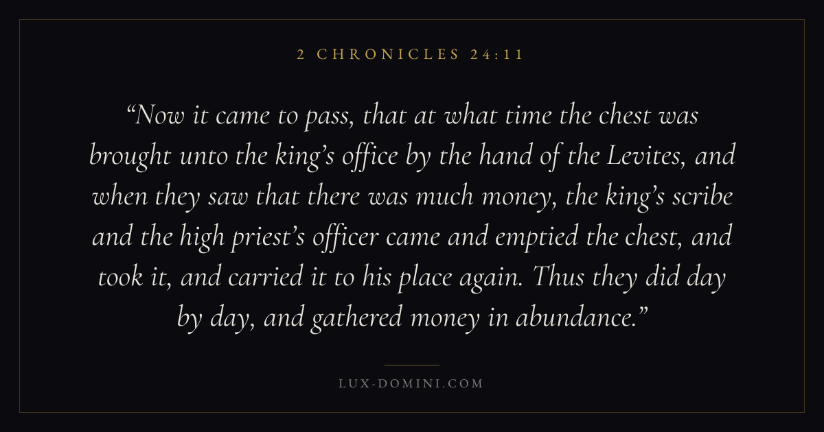 Now it came to pass, that at what time the chest was brought unto the king’s office by the hand of the Levites, and when they saw that there was much money, the king’s scribe and the high priest’s officer came and emptied the chest, and took it, and carried it to his place again. Thus they did day by day, and gathered money in abundance.
