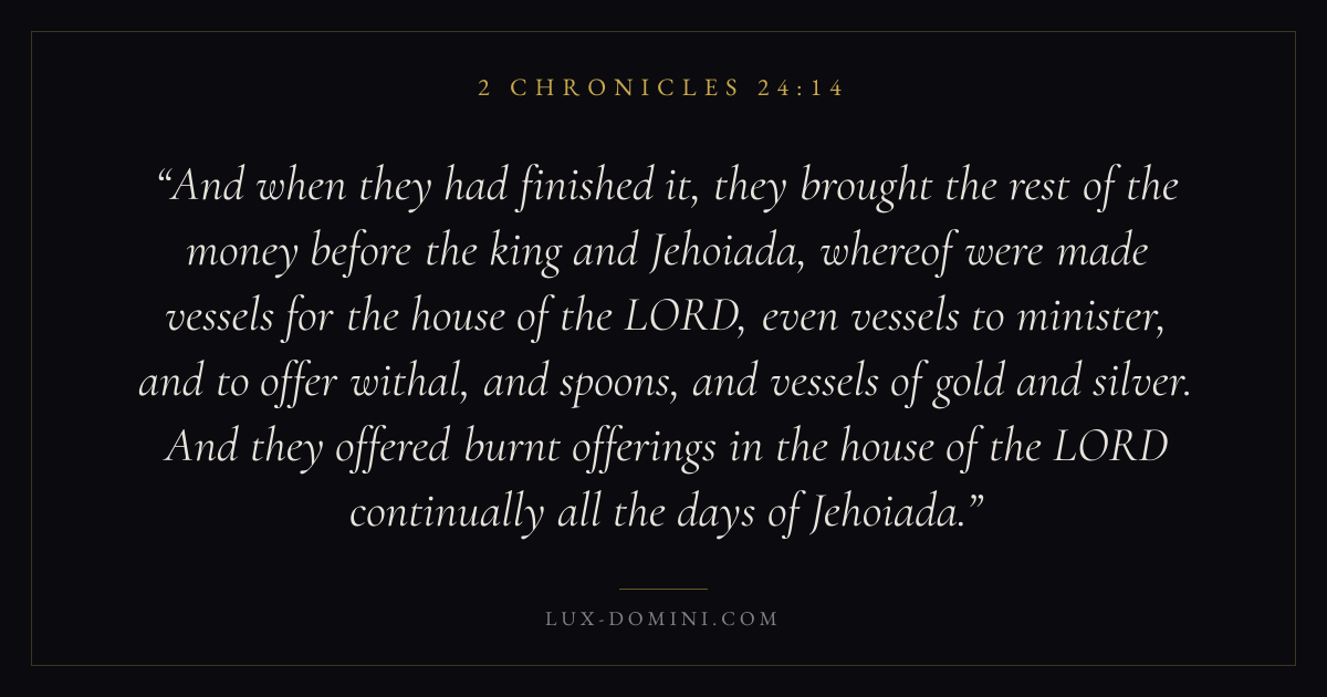 And when they had finished it, they brought the rest of the money before the king and Jehoiada, whereof were made vessels for the house of the LORD, even vessels to minister, and to offer withal, and spoons, and vessels of gold and silver. And they offered burnt offerings in the house of the LORD continually all the days of Jehoiada.