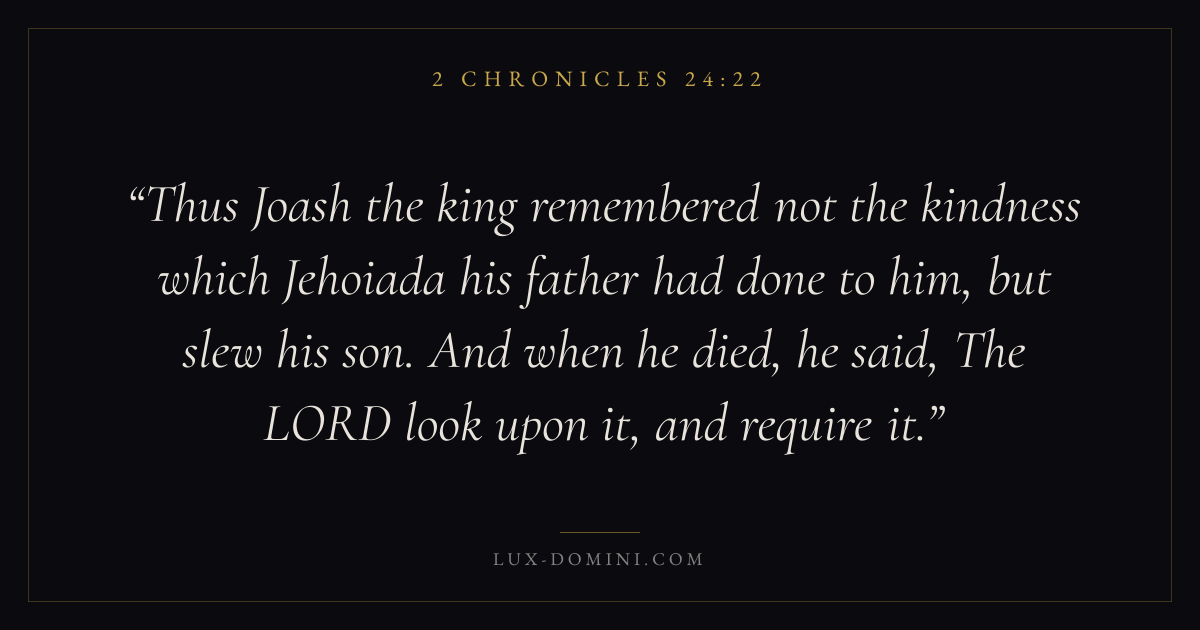 Thus Joash the king remembered not the kindness which Jehoiada his father had done to him, but slew his son. And when he died, he said, The LORD look upon it, and require it.