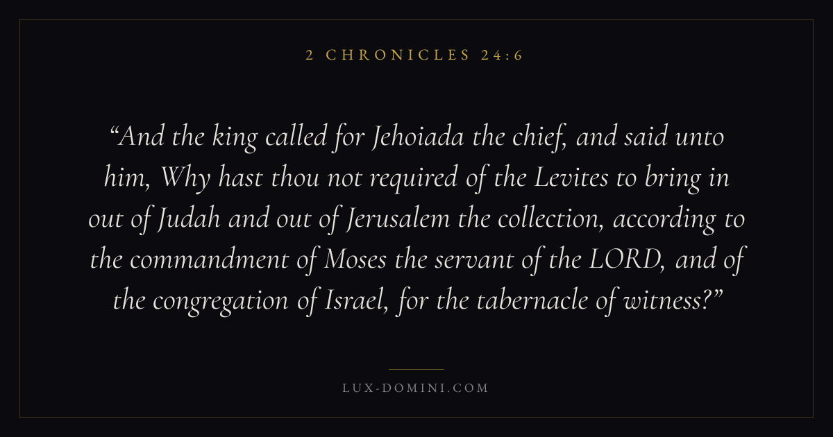 And the king called for Jehoiada the chief, and said unto him, Why hast thou not required of the Levites to bring in out of Judah and out of Jerusalem the collection, according to the commandment of Moses the servant of the LORD, and of the congregation of Israel, for the tabernacle of witness?