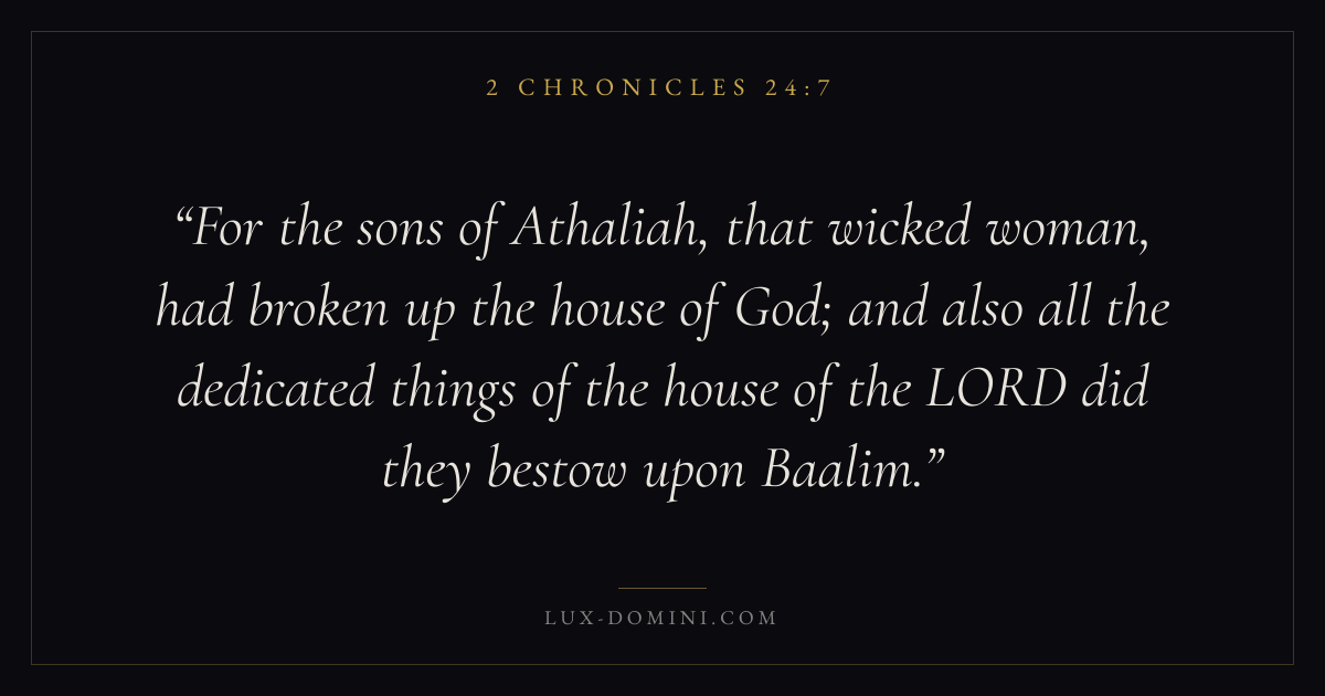 For the sons of Athaliah, that wicked woman, had broken up the house of God; and also all the dedicated things of the house of the LORD did they bestow upon Baalim.
