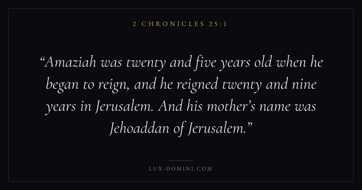 Amaziah was twenty and five years old when he began to reign, and he reigned twenty and nine years in Jerusalem. And his mother’s name was Jehoaddan of Jerusalem.