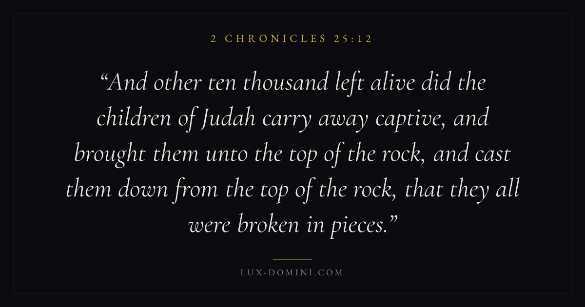 And other ten thousand left alive did the children of Judah carry away captive, and brought them unto the top of the rock, and cast them down from the top of the rock, that they all were broken in pieces.