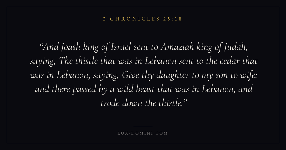 And Joash king of Israel sent to Amaziah king of Judah, saying, The thistle that was in Lebanon sent to the cedar that was in Lebanon, saying, Give thy daughter to my son to wife: and there passed by a wild beast that was in Lebanon, and trode down the thistle.