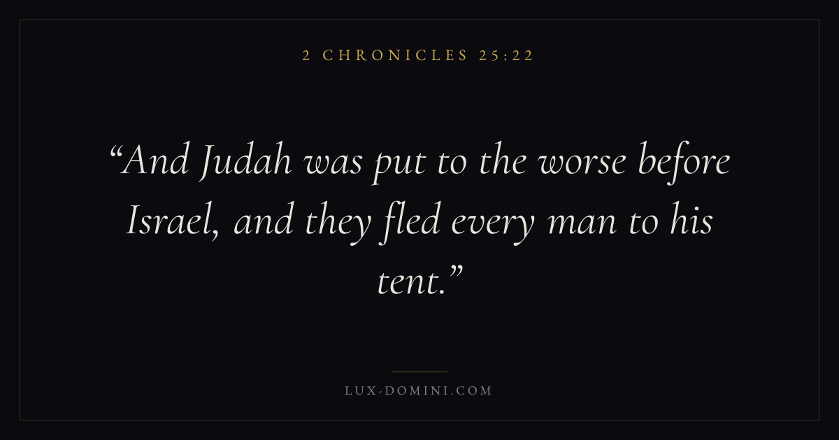 Books / 2 Chronicles / Chapter 25 / Verse 22 ← 2 Chronicles 25:21 2 Chronicles 25:22 2 Chronicles 25:23 → And Judah was put to the worse before Israel, and they fled every man to his tent. Download verse card Share on Twitter Share on Facebook Pin it ✦ Key themes PrayerJustice and mercyHumilityTemple Read with 2 Chronicles 25:192 Chronicles 25:20Matthew 6:9Luke 18:1 Related topics Bible verses about prayerBible verses about justice and mercyBible verses about humility ✦ 2 Chronicles Chapter 25 verses V. 1 V. 2 V. 3 V. 4 V. 5 V. 6 V. 7 V. 8 V. 9 V. 10 V. 11 V. 12 V. 13 V. 14 V. 15 V. 16 V. 17 V. 18 V. 19 V. 20 V. 21 V. 22 V. 23 V. 24 V. 25 V. 26 V. 27 V. 28