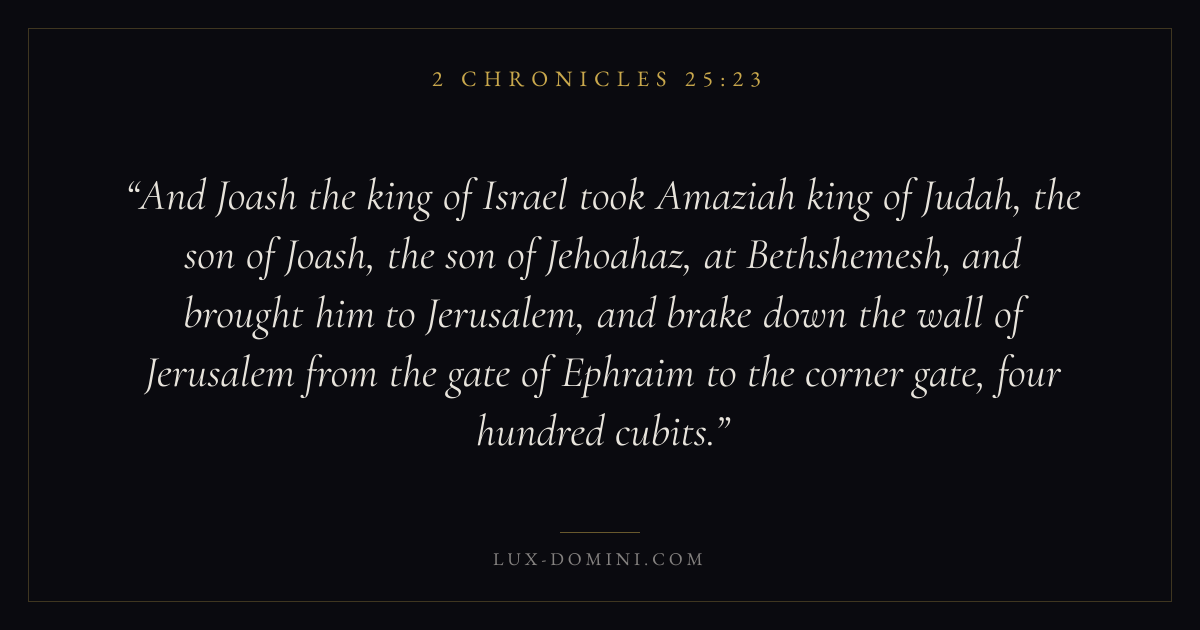 And Joash the king of Israel took Amaziah king of Judah, the son of Joash, the son of Jehoahaz, at Bethshemesh, and brought him to Jerusalem, and brake down the wall of Jerusalem from the gate of Ephraim to the corner gate, four hundred cubits.
