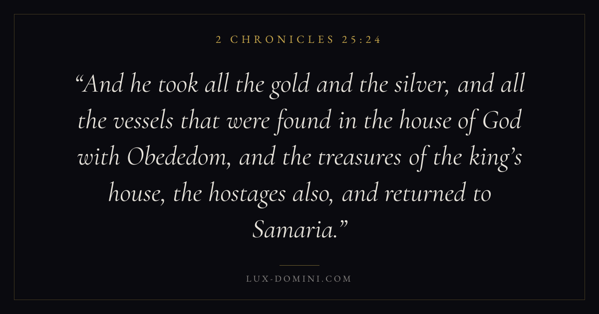 And he took all the gold and the silver, and all the vessels that were found in the house of God with Obededom, and the treasures of the king’s house, the hostages also, and returned to Samaria.