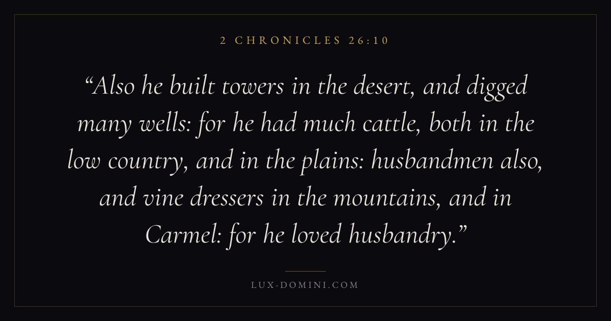 Also he built towers in the desert, and digged many wells: for he had much cattle, both in the low country, and in the plains: husbandmen also, and vine dressers in the mountains, and in Carmel: for he loved husbandry.