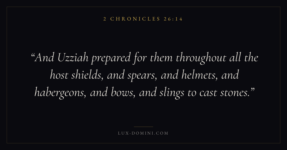 And Uzziah prepared for them throughout all the host shields, and spears, and helmets, and habergeons, and bows, and slings to cast stones.