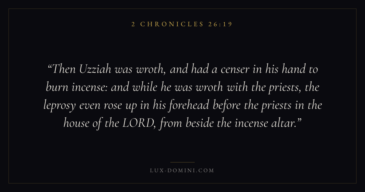 Then Uzziah was wroth, and had a censer in his hand to burn incense: and while he was wroth with the priests, the leprosy even rose up in his forehead before the priests in the house of the LORD, from beside the incense altar.
